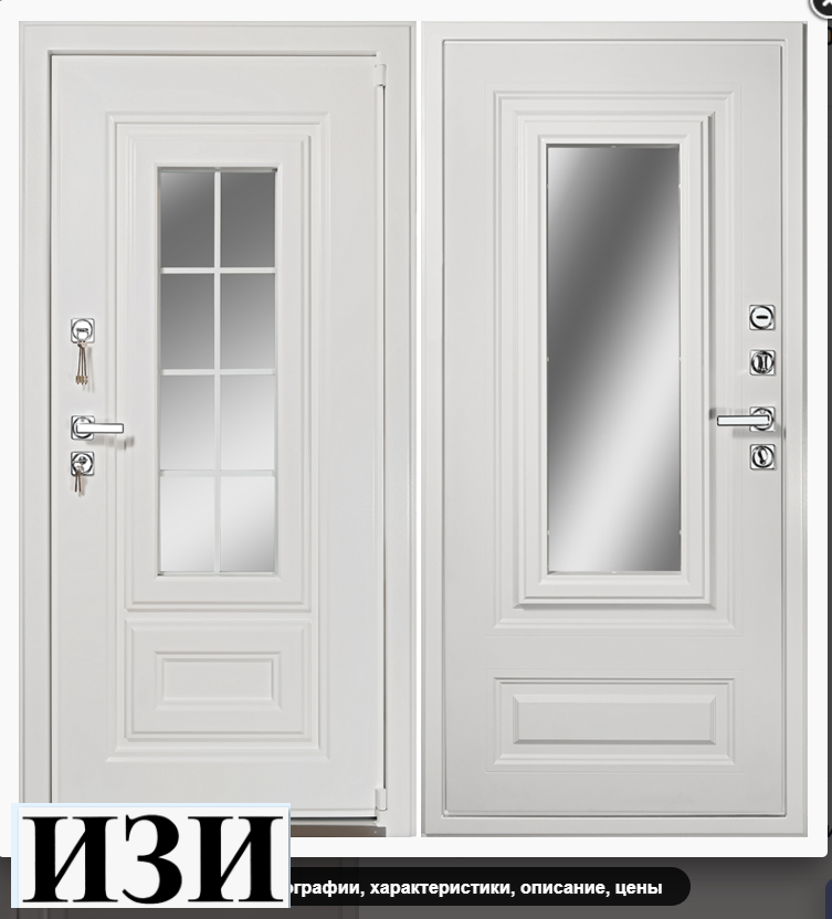 Наружная отделка: металлические филенки англия 2 шт. в верхней филенке стеклопакет двухкамерный тонированный, снаружи светлая бронза, внутри темная бронза и ковка решетка (внутри стеклопакета) + фигурный наличник Внутренняя отделка: 2-й лист металла, МДФ 16мм. рис. Эверест, цвет Белый софт, альянс