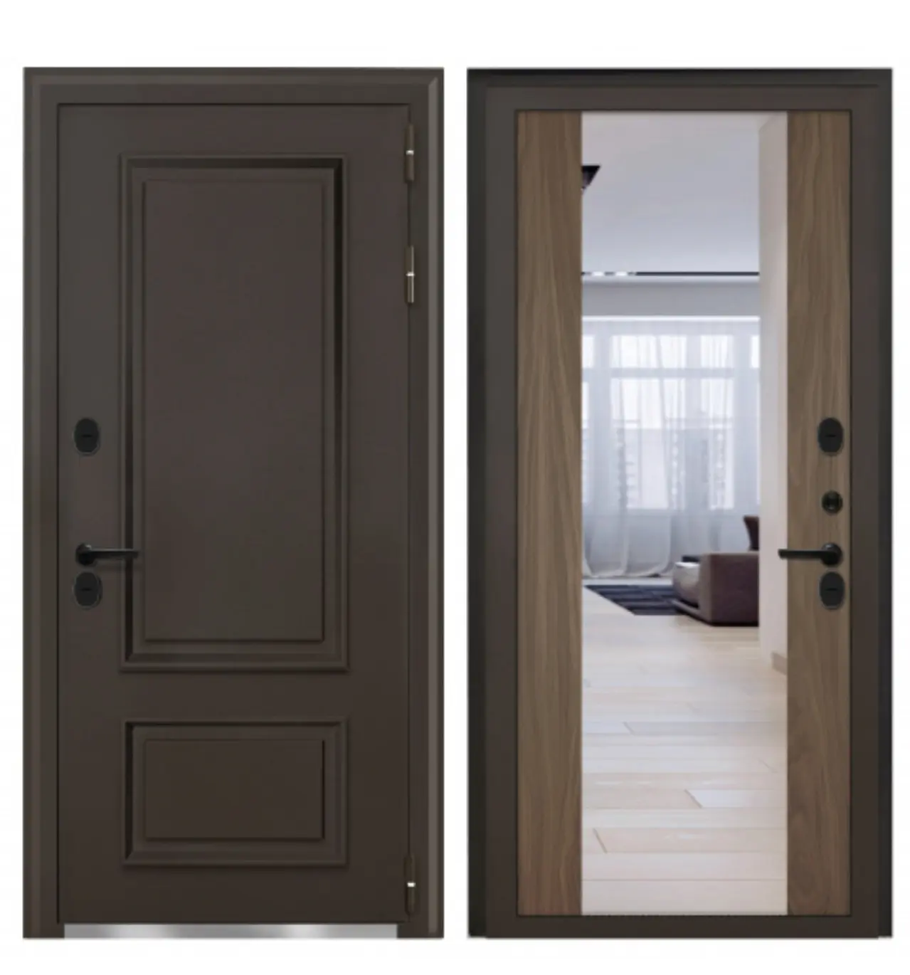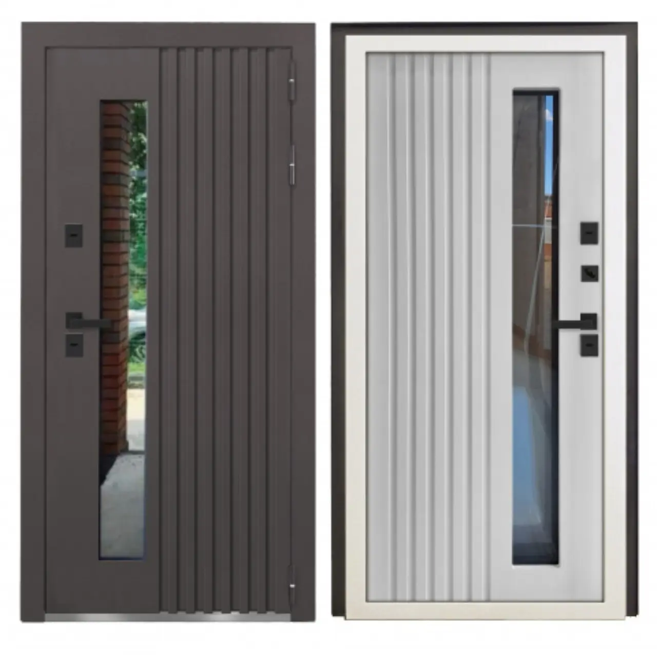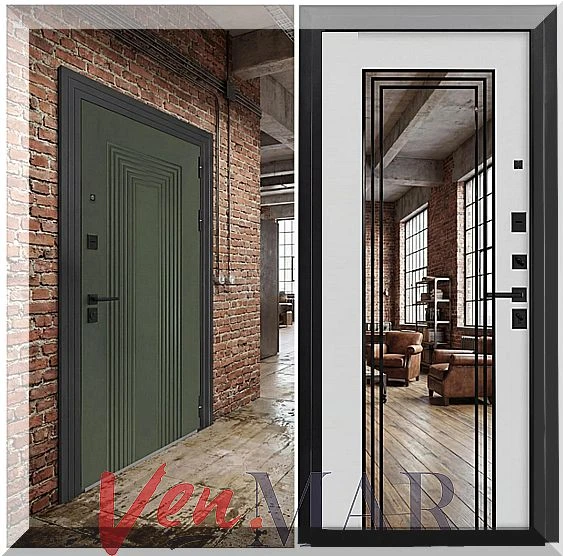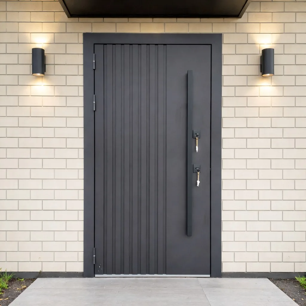 Современные металлические двери: Гладкие поверхности, минималистичный дизайн, встроенные стеклянные вставки, футуристические ручки. Идеально для домов в стиле хай-тек или лофт.
