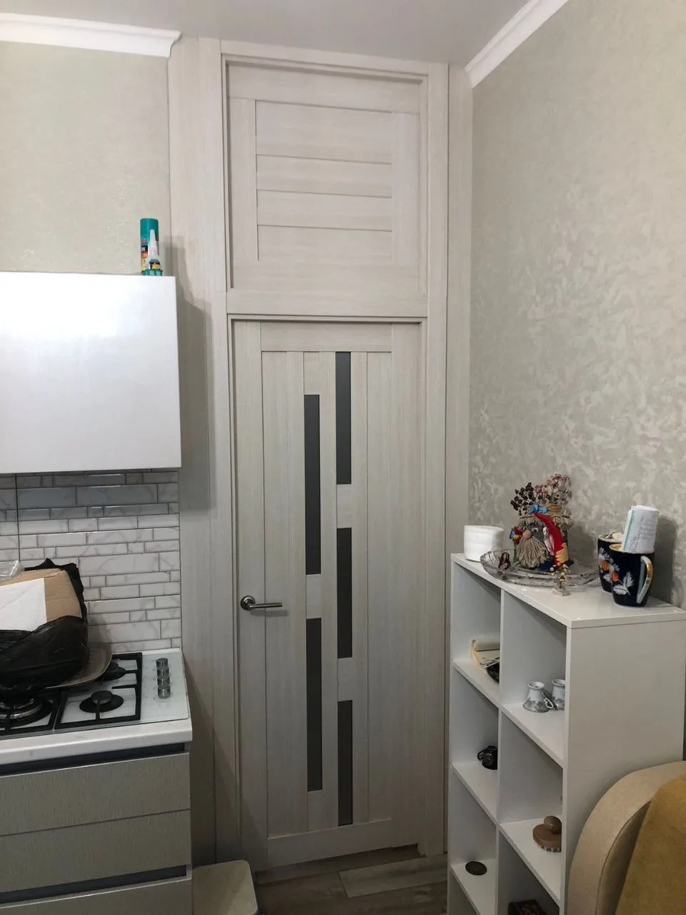 Фото 5: Раздвижная стеклянная дверь с матовым узором, разделяющая кухню и столовую.