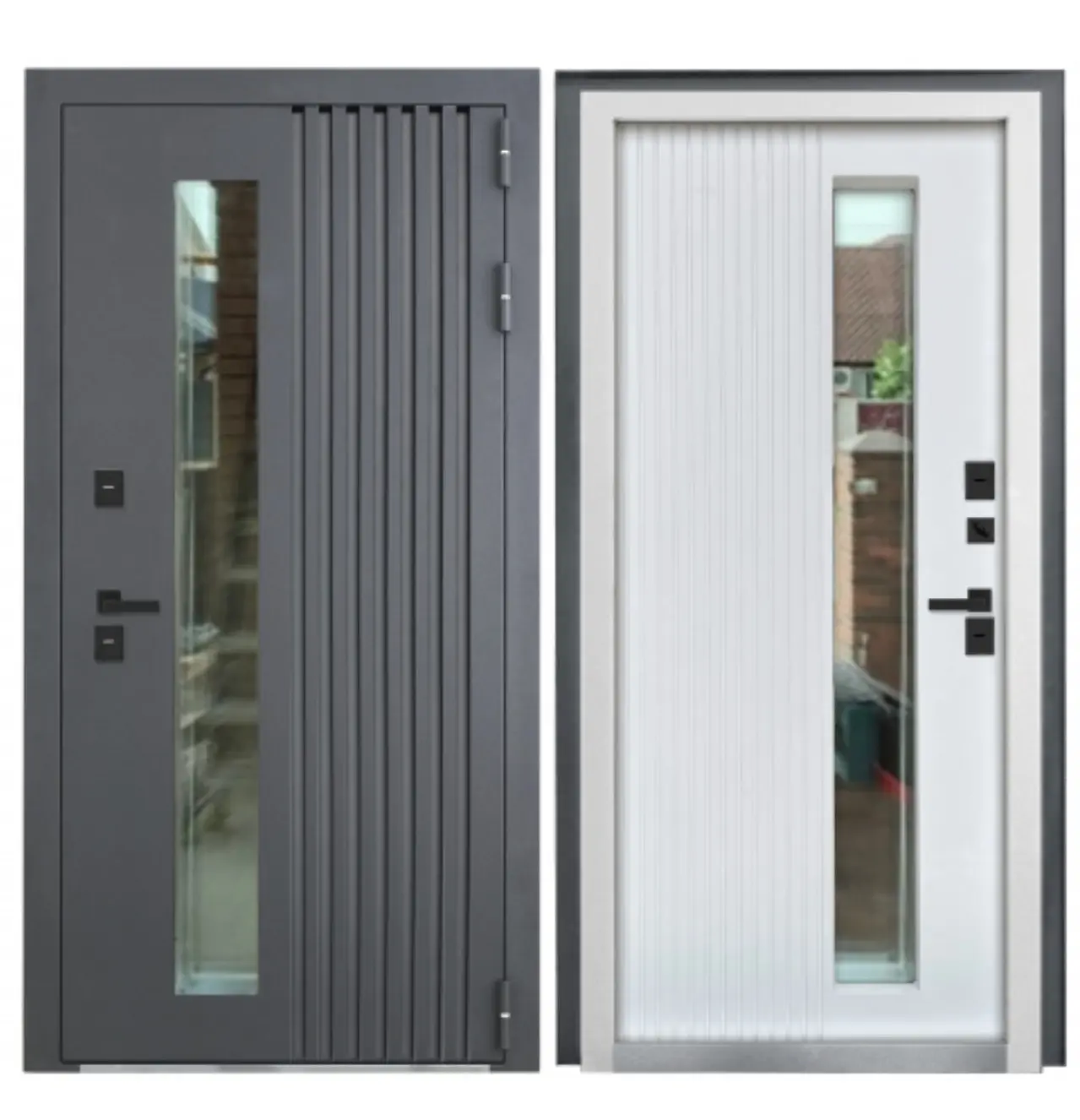 Современные металлические двери: Гладкие поверхности, минималистичный дизайн, встроенные стеклянные вставки, футуристические ручки. Идеально для домов в стиле хай-тек или лофт.