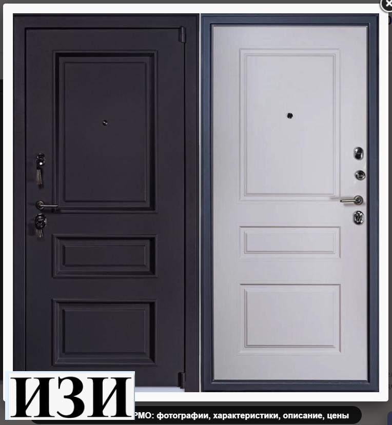 | Внешняя отделка | Цвет Муар RAL 7024 + цинкогрунтовочный слой, порошково-полимерное покрытие + декорирование металлофиленками Виктория три филенки + фигурный наличник; |