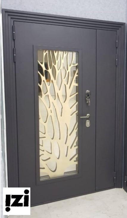 Снаружи лист металла, а внутри отделка декоративной панелью, такие двери относиться к типу дверей Металл/МДФ.Снаружи: объемная давка по металлу 1 металло штапик в цвете Муар 8019